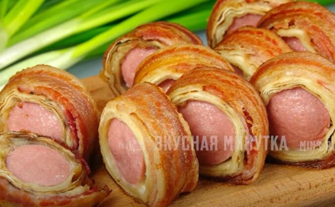 Сосиски в лаваше с сыром и беконом в духовке по рецепту кухни наизнанку. Быстрая закуска готовиться за 15 минут..