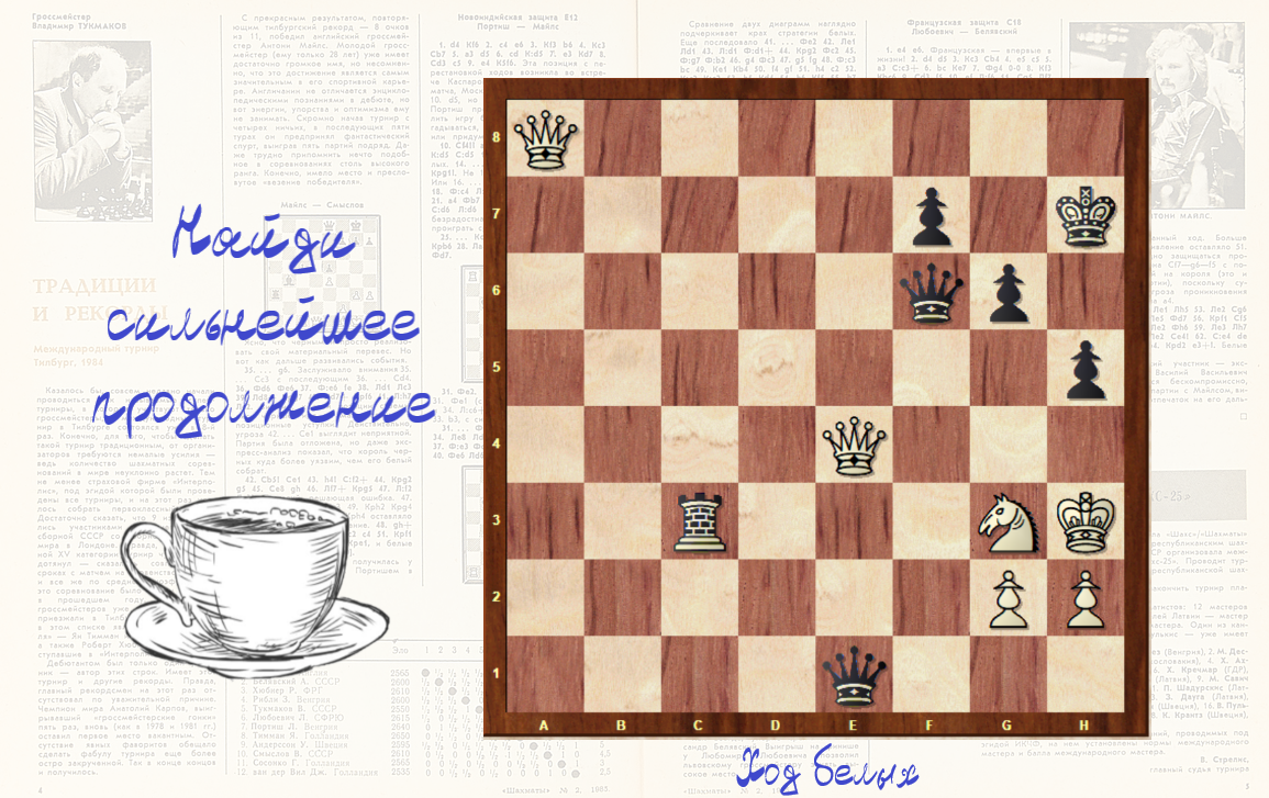 Решение вчерашней комбинации: 1. Се6 Ле6 2. Лb6 h1Ф 3. е8Ф Крf5 4. Фе6 Крf4 5. Фh6