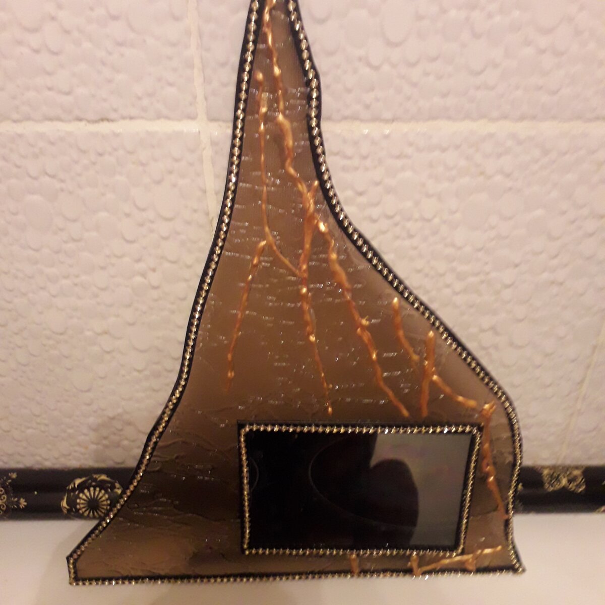 Оправа из разбитого стекла, а зеркало у меня было. Вот такое зеркало на подставке. Решила объединить и стекло и зеркало.