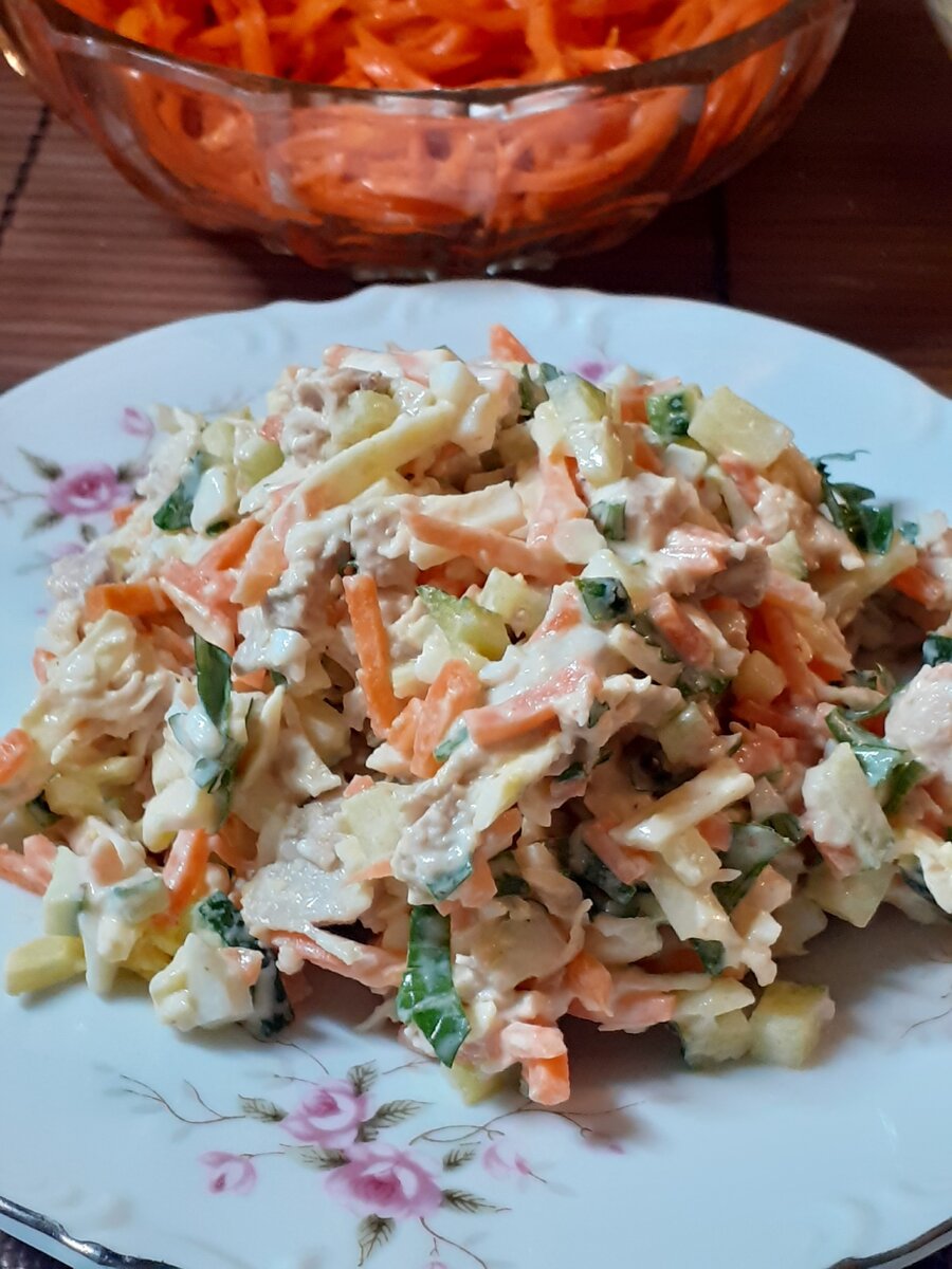 Перепробовала много салатов с морковью по-корейски: сама готовила и в гостях угощали, но остановила свой выбор на этом салатике. Готовить легко и быстро и теперь, когда варю куриный бульон, оставляю немного курочки для салата. Одним словом вкусный салат, хорошая альтернатива оливье, на мой взгляд.