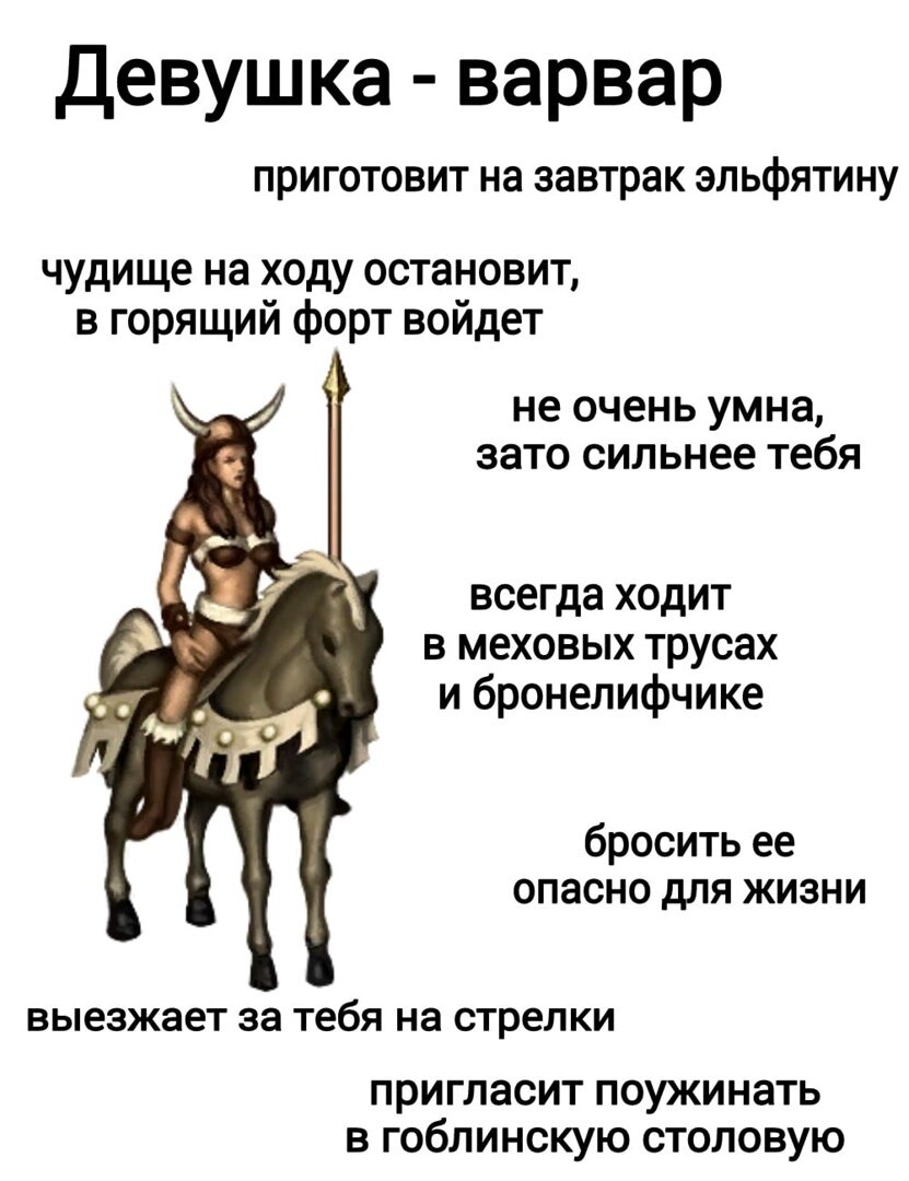 Всем привет. Бывает такое, придумали мем по игре, а он ушел в жизнь. А ведь правда, в любой девушке есть что-то от героини средневекового фэнтезийного мира. Что-то магическое или дикое, спокойное или мрачное. Приглядитесь, может и в вас(если вы дама) или в вашей спутнице(если вы кавалер) есть некоторые из этих качеств, кто знает?:) Кто узнал себя - на коня и вперед на поиски приключений! Ну а если вам больше по душе спокойные развлечения, полистайте наш дзен-канал там много веселого и интересного:)