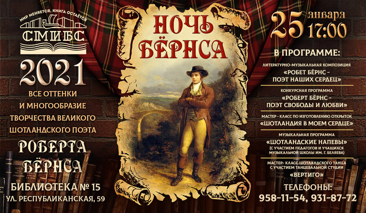 25 января 17:00 в Библиотека № 15 СМИБС Самара #СМИБС уже по традиции, в третий раз пройдёт «Ночь Бернса».