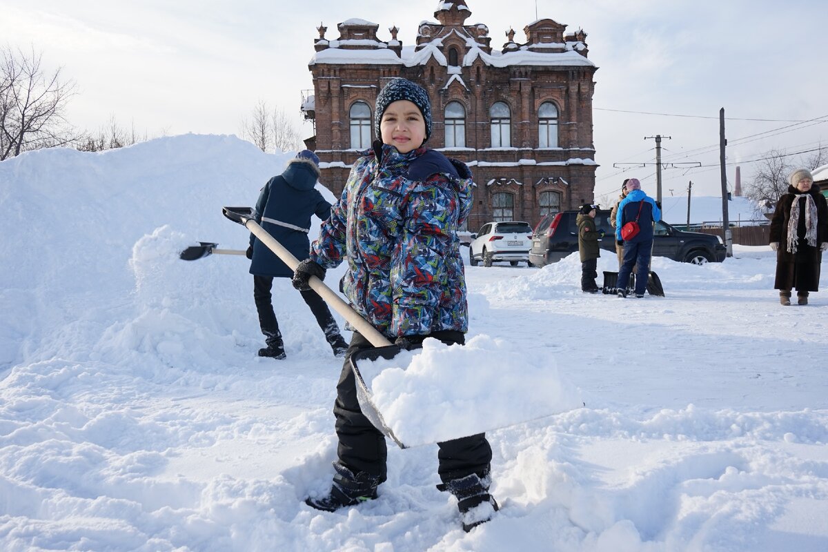 Но если для создания этнопарка еще требуется время, то для зимних развлечений уже все есть. Пока взрослые разгребают от снега площадку для игр, мальчишки и девчонки, побросав свои лопаты, устроили веселую забаву — „Царь горы“. Победителем становится тот, кто дольше всех продержится на вершине снежной кучи. А в „Лапту“ и „Городки“ дети играют наравне со взрослыми.