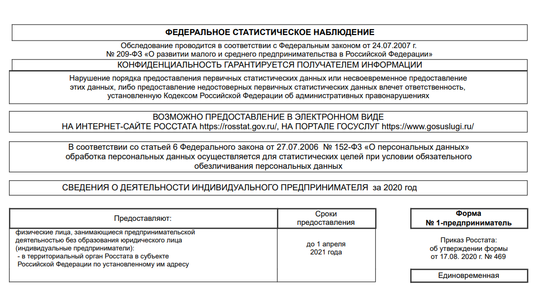 В этом году проводится сплошное статистическое наблюдение по форме 1-предприниматель. Это означает, что эту форму в срок до 01 апреля 2021 года должны сдать все предприниматели. Поэтому сначала разбираемся с этой формой, затем рассказываю, где и как узнавать, нужно ли Вам что-то сдавать в статистику (выборочное статистическое наблюдение проводится каждый год). Что собой представляет отчет Включает общие сведения о предпринимателе (ИНН, ОКПО, адрес осуществления деятельности), количество работников/помощников, данные по выручке (в разрезе видов деятельности), сведения об основных фондах (если имеются и используются непосредственно в деятельности). Заполнить форму не сложно (подробные разъяснения по заполнения полей прям в форме есть). При желании можно сделать это самостоятельно. Скачать/просмотреть ее можно по этой ссылке: https://yadi.sk/d/K6WCpVVp9wJ93Q?w=1 Что будет, если не отчитаться в срок * КоАП РФ Статья 13.19. Непредоставление первичных статистических данных В целом статист