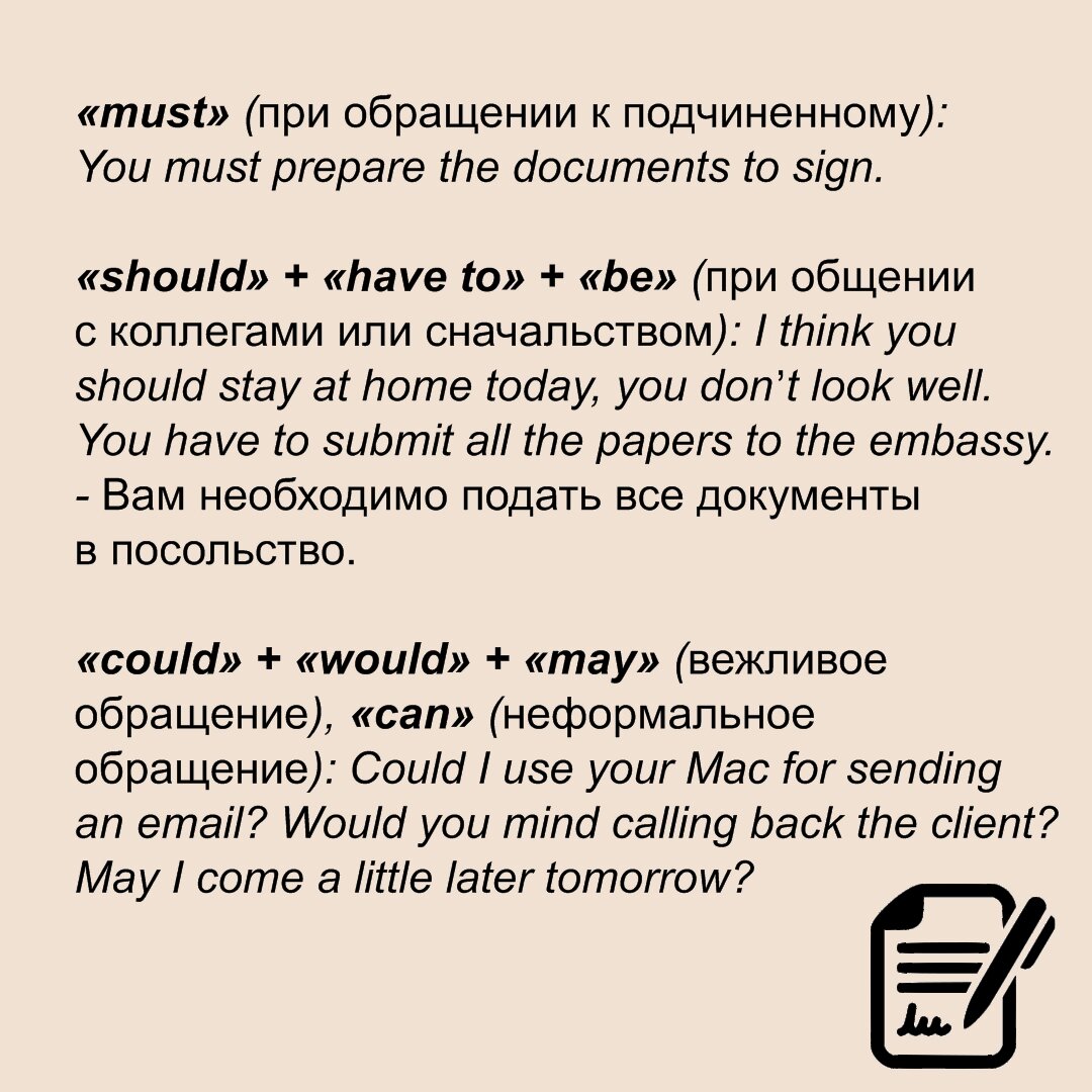 «must» (при обращении к подчиненному): You must prepare the documents to sign.
