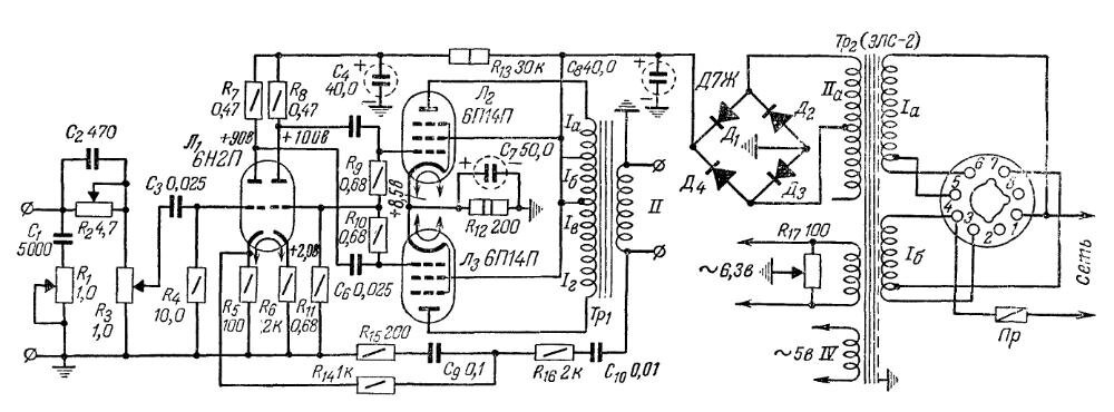 Регулятор тембра высших частот состоит из конденсатора С1 и потенциометра R1. В верхнем по схеме положении движка потенциометра, когда движок потенциометра R1 (регулятор тембра высших частот) находится в нижнем, а движок потенциометра R2 (регулятор тембра низких частот) в левом по схеме положении, частотная характеристика имеет подъемы на крайних частотах. При других крайних положениях движков этих потенциометров частотная характеристика имеет завалы на крайних частотах. Питание усилителя осуществляется от выпрямителя, выполненного на диодах типа Д7Ж. Для уменьшения уровня фона накал ламп заземлен через среднюю точку потенциометра R17.