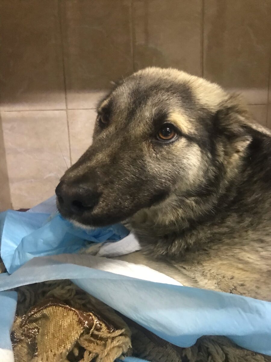 Из наркоза вышел хорошо, сегодня проведала. Пока не встаёт, но в настроении. Ещё некоторое время побудет в клинике, затем нам потребуется тёплая передержка, так как вся попа выбрита и требуется реабилитация.