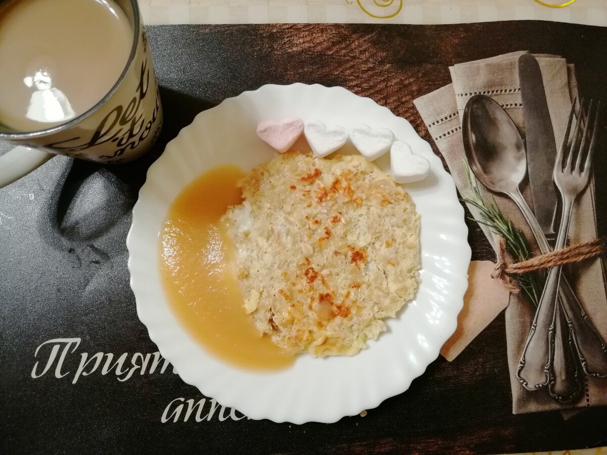 Овсяноблинчик с детским пюре. Маршмеллоу. Кофе с молоком.