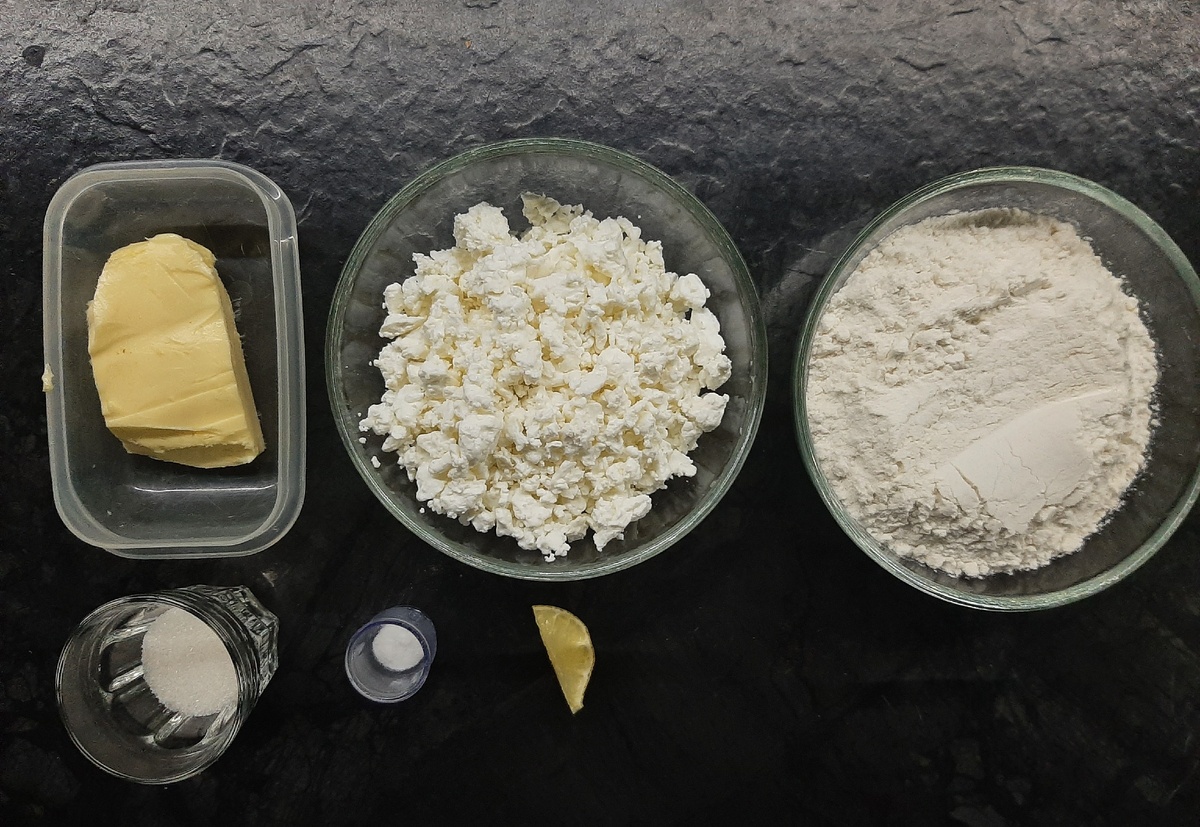1. В отдельную емкость кладем творог, масло, сахар, гашеную соду или разрыхлитель. Далее добавляем муку и замешиваем тесто.