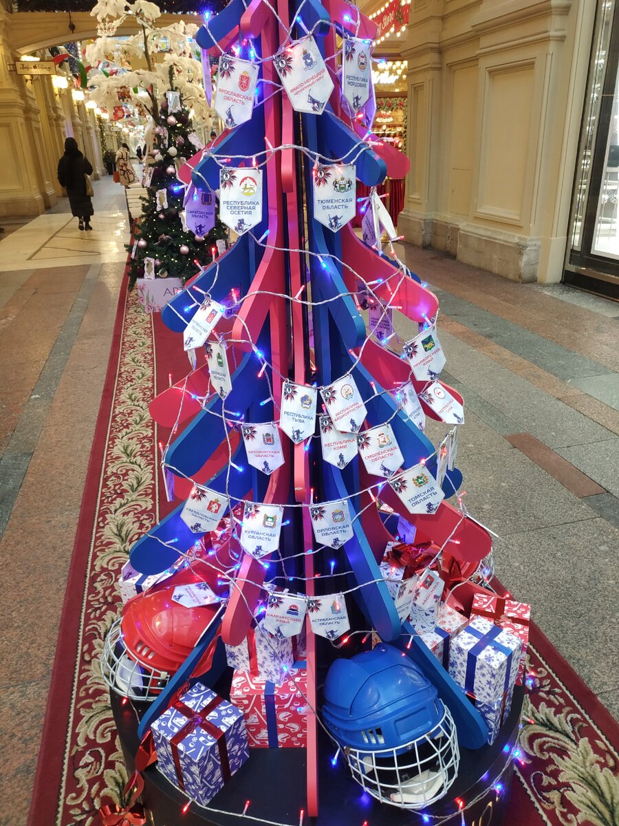 Не устаю восхищаться фантазии дизайнеров этих ёлочек! Вот например хоккейная ёлка. Изготовлена из клюшек синего и красного цвета,украшена флажками с названиями хоккейных регионов. Флажка Омской области я так и не нашла,хотя трижды обошла ёлочку. Эх...