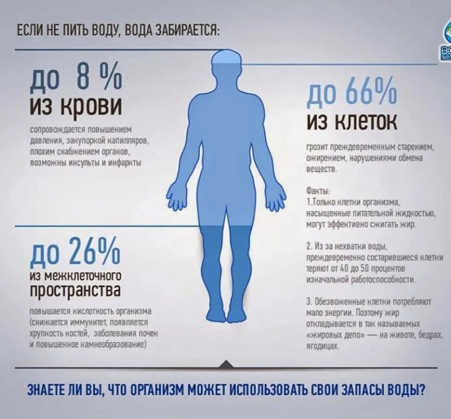 Всем нам известно, что человеческий организм состоит из воды от 50% до 80%. Что же происходит с организмом, когда мы употребляем недостаточное количество воды? -В первую очередь из внутренних ресурсов. До 8% организм при недостаточном употреблении воды забирает из крови. В данном случае сосуды сужаются, кровь густеет,
