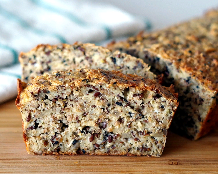 Это простой хлеб с отрубями, зернами подсолнечника и овсяными хлопьями. Без муки и дрожжей, приготовленный на основе из яиц и пахты.
