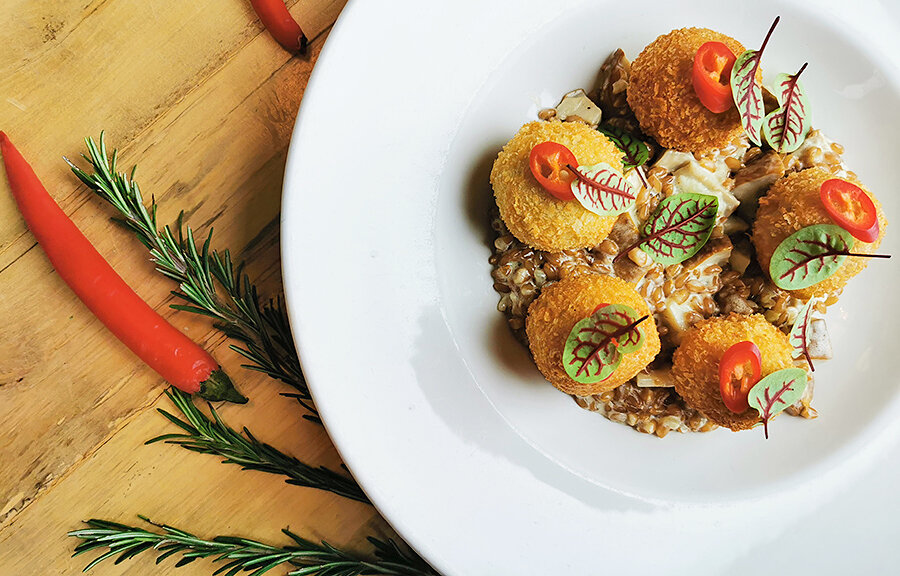 Сервируем – в тарелку перекладываем полбу с грибами, сверху укладываем «конфеты», небольшие кусочки чили и зелень. Все готово!