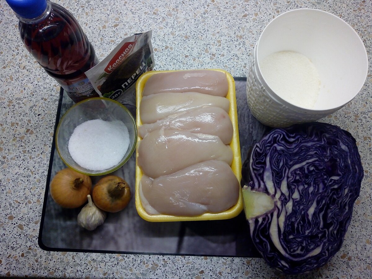 Всем привет! Сегодня на ужин готовим необычную тушёную краснокочанную капусту с куриным филе.