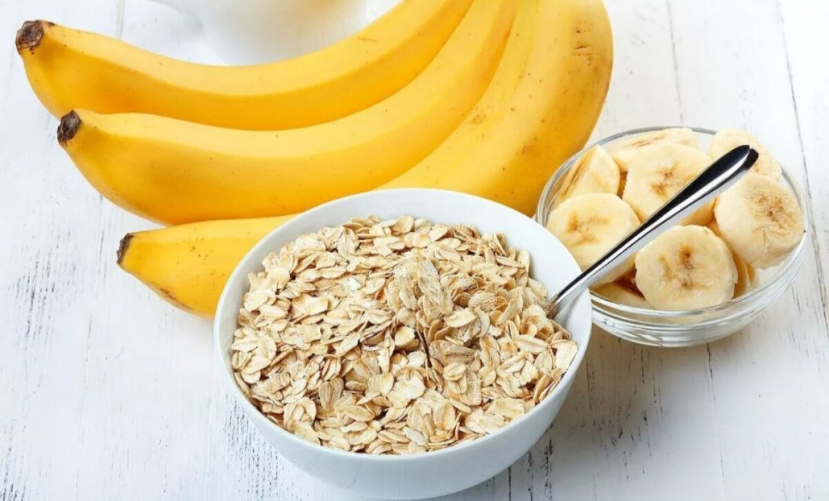 1) Возьмите большой спелый банан, овсяные хлопья (которые завариваются кипятком) и любые другие ингредиенты...
