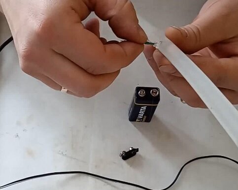 Ваши дети точно оценят такую поделку, изготовленную специально для них. Добрый день дорогие друзья. Сегодняшняя поделка будет больше рассчитана для наших детей. В очередной раз сидел и думал какой интересной статьей вас порадовать. Ничего не придумал лучше чем пойти поиграть с сыном в дэнди (любимая игра у нас с ним контра). Проводя время с ним я и придумал эту статью. Для этой поделки нам потребуется клеевой стержень, батарейка крона и еще пару мелочей о которых расскажу далее. Берем клеевой стержень и нагретым паяльником делаем углубление в нем с торца примерно на 3 мм. Пока отверстие находится в разогретом состоянии нам потребуется самый главный элемент который стоит целых 15 рублей в любом радиотехническом магазине. Вставляем светодиод в это отверстие и даем застыть там. Светодиод таким образом помещаем с обеих сторон. Точно таким же образом нам необходимо нагреть и поместить светодиод по центру. Принципиально вымерять центр нет необходимости, все делается на глаз. Теперь послед