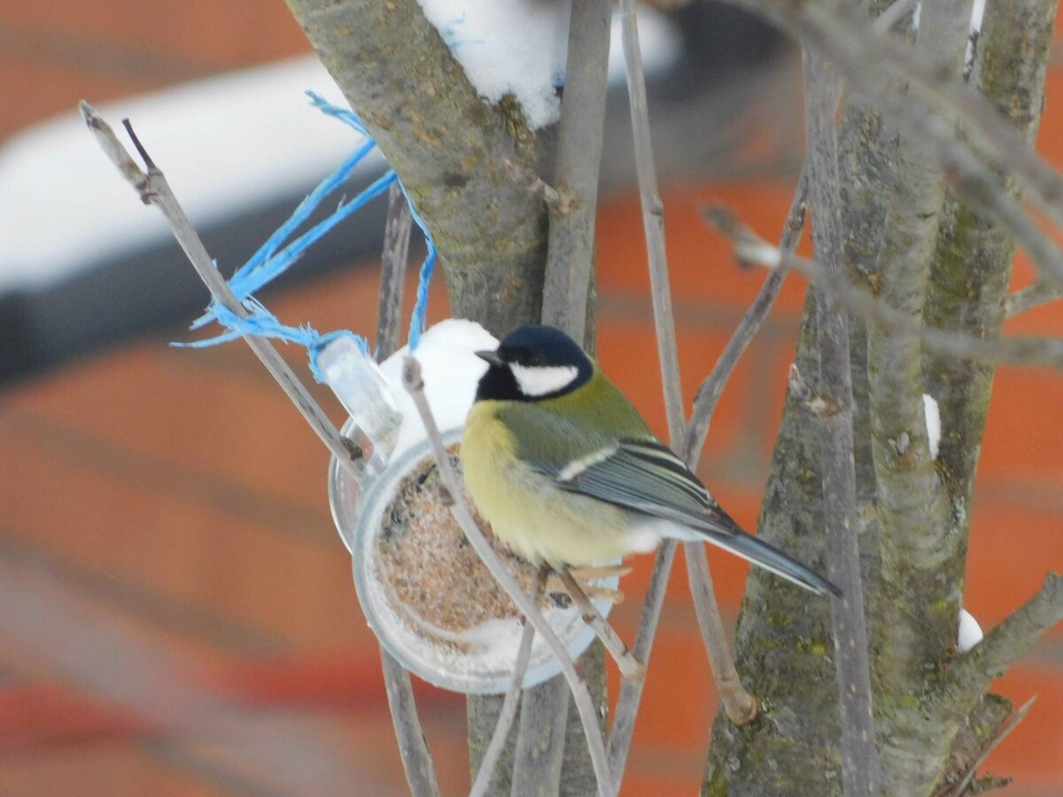 Их конкуренты - синички - не ждут появления зерна и семечек в больших кормушках, а с утра налетают на чайные чашки и бокалы, наполненные жировой подкормкой - топленый нутряной жир+дробленые семечки и зерно
