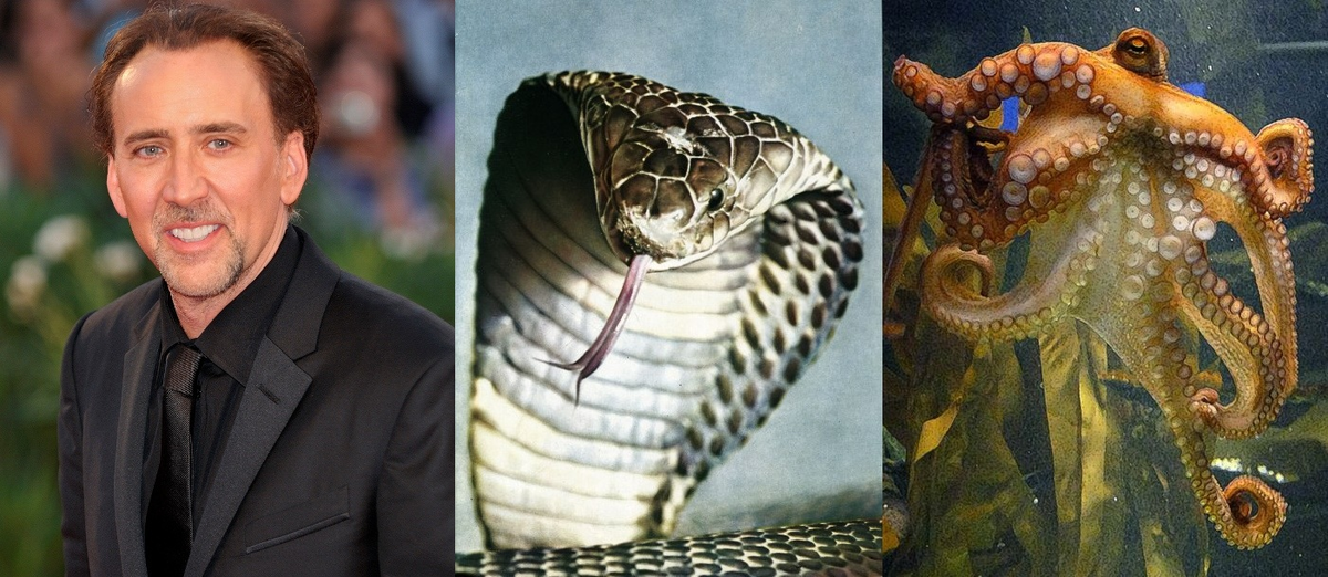 Голливудский актер Николас Кейдж тратит свое многомиллионное состояние не только на автомобили и недвижимость, он также не скромничает и в выборе экзотических животных. Николас потратил внушительную сумму на двух королевских кобр Моби и Шеба и осьминога.