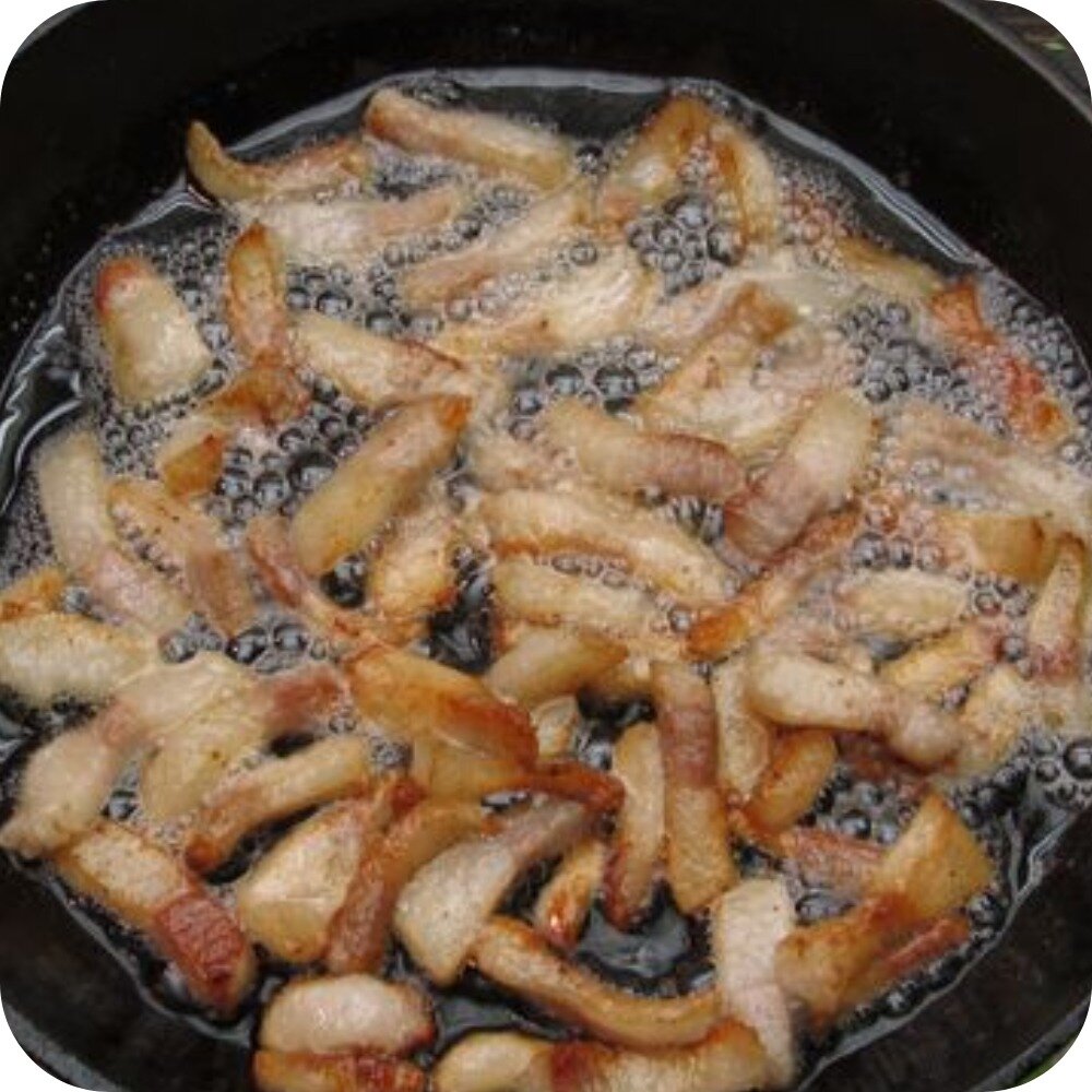 1. Сало нарезаем и обжариваем на медленном огне до образования хрустящих шкварок.