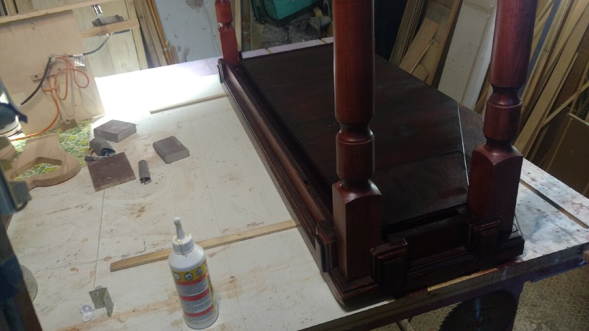 Четыре токарных балясины превратились в ножки на столешнице, которую вышкурил от слоя старого лака и выкрасил человеческой итальянской морилкой "Красное дерево" и покрыл двухкомпонентным, прозрачным грунтом с краскопульта.