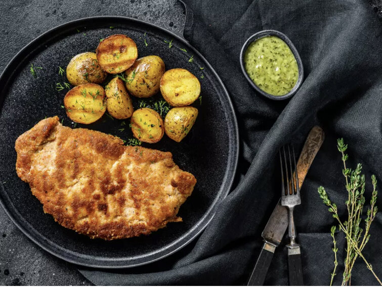 Пропитанная молоком корейка имеет преимущество перед обычными свиными отбивными - свинина более нежная и мягкая. Вы можете добавить в молоко половину луковицы или лука-порея, чтобы придать мясу интригующий вкус. Затем пора обвалять свиные отбивные в панировочных сухарях и обжаривать их.