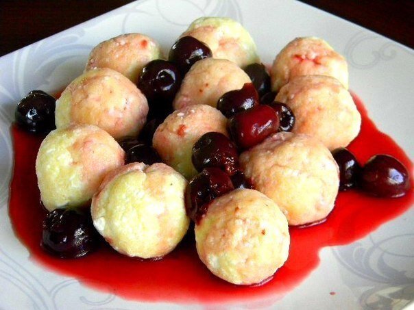 4. Я брала замороженные вишни. В принципе их можно и не размораживать, а только убрать лишний лёд. По ягодке кладём на лепёшку и защипываем края. Формируем круглые клёцки.