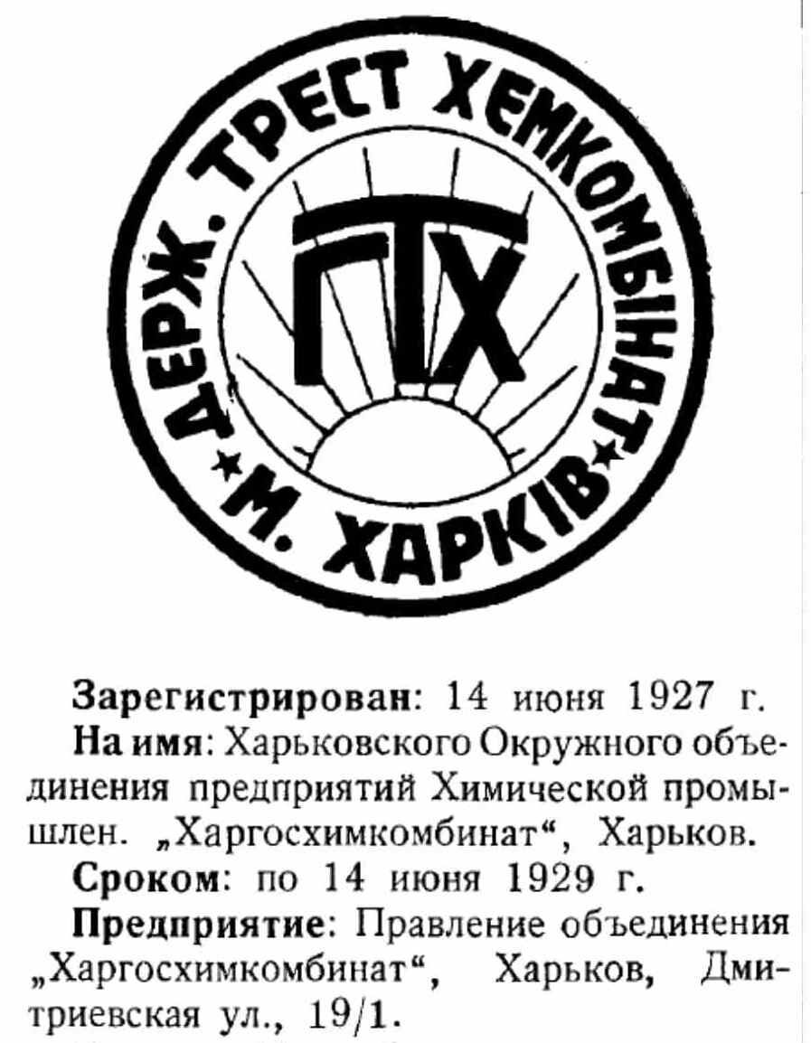 • 1928 – 1933. Харьковское Окружное объединение предприятий химической промышленности "Харгосхимкомбинат".