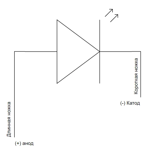 - короткая ножка это (-) и широкий, большой "электрод" в кристалле