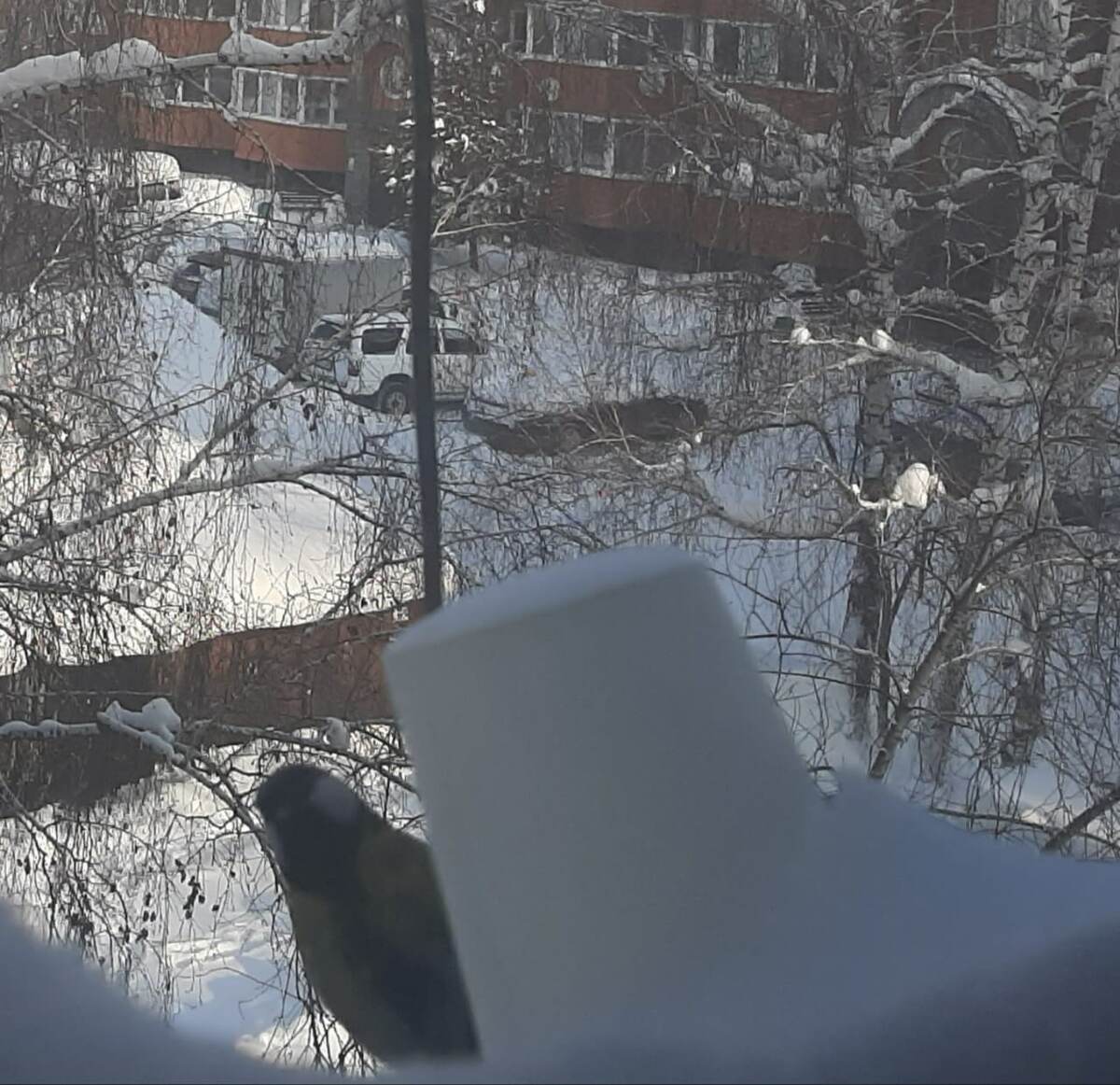 Тогда уже потеплело, но была сильная метель, ветер, снегопад. С крыш тоже слетал снег и прилипал к окнам, заносил кормушку. Пара снегирей —