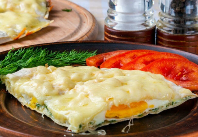 Идеальные завтраки на всю неделю готовятся буквально в два счета. Тратим несколько минут, а получаем и здоровое и очень сытное начало дня. Рецепты можно использовать по одному в день, как раз хватит на всю рабочую неделю. Первым сделаем омлет в лаваше с сыром и ветчиной. Для него потребуются 3-4 яйца, щепотка соли, тонкий лаваш, граммов 30 твердого сыра, ветчина и пара перьев лука. Еще проще