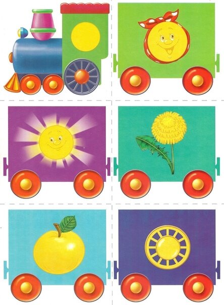 Раздайте карточки с паровозиками детям. Затем показывайте поочередно карточки с вагончиками, которые везут различные предметы. Дети подбирают предметы по цвету и по форме к фигуре, которая нарисована на паровозике.