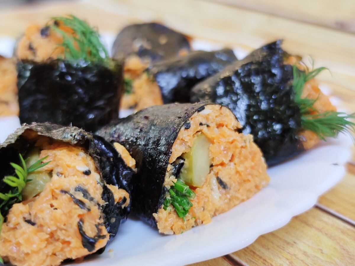 Если у Вас имеется соковыжималка, то предлагаю этот рецепт суши, похожие на суши с тунцом, по внешнему виду, и по вкусу, удовлетворяющие желание покушать этот вид японской кухни, без употребления рыбы.