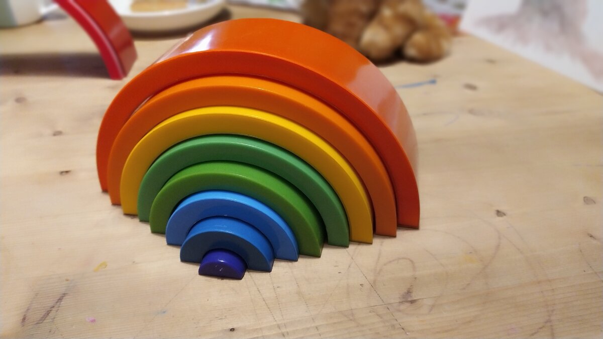 Но помимо этого в радуге есть ещё минусы. Вот ребёнок собрал пирамиду с моей помощью, и ставит последнюю деталь и...