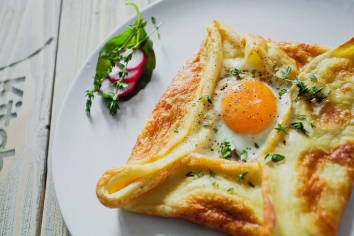 Если вы любите блины, которые, кстати, отлично сочетаются с любыми ингредиентами, то вам точно понравится яичница в блинчике. Рецепт можно дополнить любимым сыром и свежими ароматными травами.