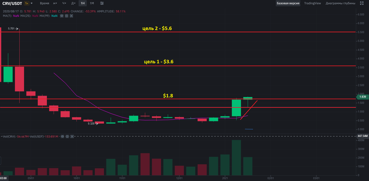 Данный обзор будет посвящен монете CRV. На данный момент ее капитализация составляет $341 млн, а рост за минувшие сутки составил +30%. Монета вышла из ценового застоя 15 января 2021 года. С того времени рост составил более, чем 100%. С 18 по 20 января эта монета ушла в ценовую коррекцию, после чего, сегодня продолжила свой рост. Вся суть