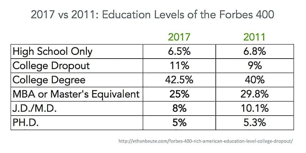 Давайте посмотрим на ситуацию объективно. Forbes давно собрал для нас все данные. Мы можем посмотреть, какой процент долларовых миллиардеров закончили школу, какой процент выпустились из колледжа и так далее.