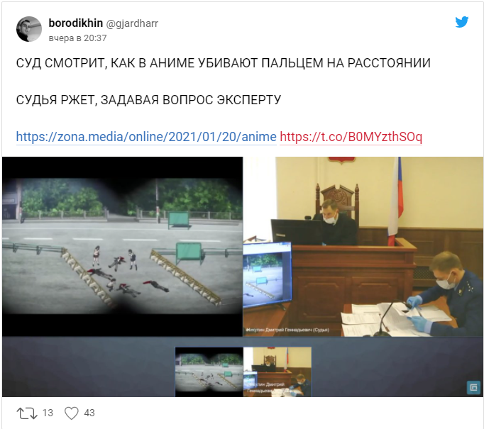 Сам суд представлял из себя нечто смехотворное. Вначале судья был преисполнен оптимизма и вел дело с некой толикой сарказма и смешков. Но чем дальше заходило дело, тем более серьезным становился судья. Только представьте себе картину: в зале сидят взрослые, серьезные и образованные люди и смотрят аниме. Да, они смотрели аниме в прямом эфире, как будто это "ламповый" стрим на онлайн площадке. Только донатов не хватало.