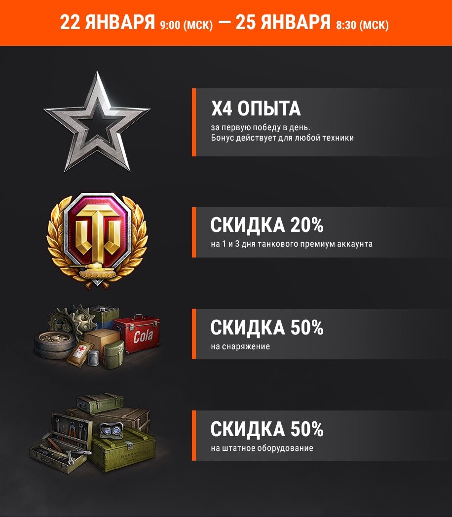 С 22 января 09:00 (МСК) по 25 января 08:30 (МСК) вас ожидает: • В 4 раза больше опыта за первую победу в день на любой технике. • Скидка 20% на 1 и 3 дня Танкового премиум аккаунта. • Скидка 50% на снаряжение. • Скидка 50% на штатное оборудование.