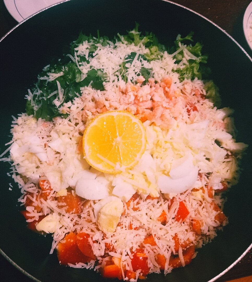 Обычно, когда я думаю о салате с креветками, первая мысль - надо заморачиваться, это все долго и неудобно, все время откладываю на потом. На самом деле, много времени не занимает, не больше, чем любой другой салат. Опытная хозяйка приготовит за 30-35 минут, а так как я люблю сам процесс, я слушаю музыку во время приготовления, пританцовываю, в общем..у меня уходит на подобное 40-45 минут)).