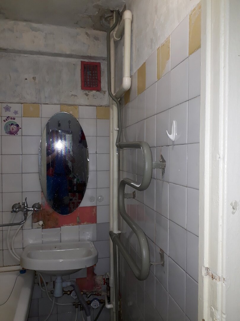 Почти вплотную к ванне стояла раковина без ножки и висело небольшое зеркало. На самом деле очень многие хрущёвки в таком состоянии вызывают у хозяев страх перед первым шагом. Когда мы заезжали в свою хрущёвку, то ванная выглядела примерно схожим образом, может быть чуть лучше. Но нами всё же решено было объединять её с туалетом, чтобы выиграть немного места. Здесь хозяева оставили всё как есть.