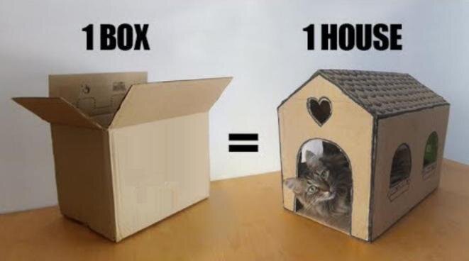 Рассмотрим подробно, как сделать домик для кошки из коробки. Проблем с подбором основы возникнуть не должно. Любая упаковка из-под принтера, микроволновки или другой крупной бытовой техники придется впору. Для этих целей даже сгодится посылка «Почты России», главный принцип отбора – плотный картон. Привлечение детей сделает процесс увлекательным занятием для всей семьи.