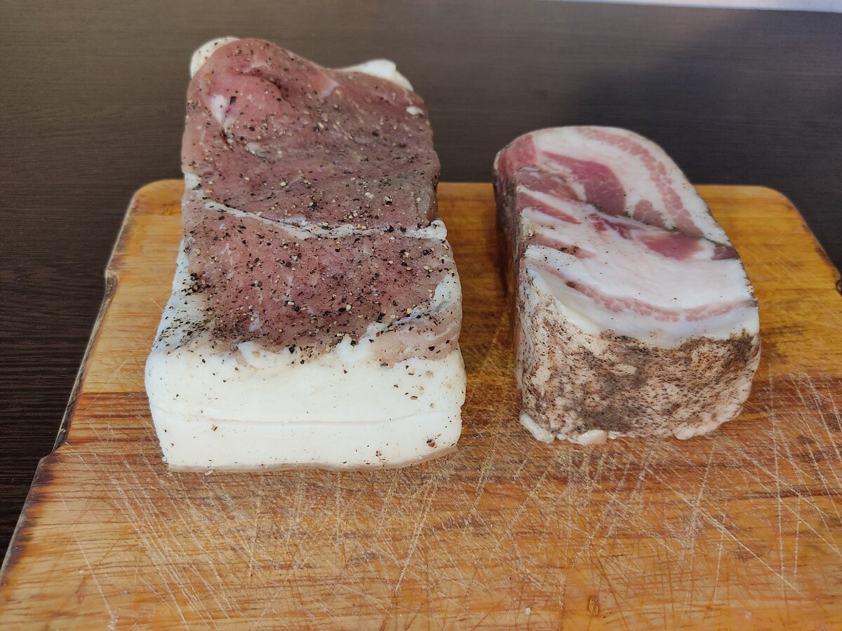 Скорее всего, вы угадали. Сало с левой стороны нам передали родственники, которые живут в деревне под Саратовом и держат свою скотину. А кусок с правой стороны, я купил в ближайшем «Магните».