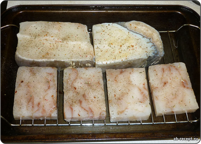 2. Наливаем в поддон стакан воды, она не позволит рыбе высохнуть и пригореть. Куски филе солим, перчим, добавляем специи по вкусу и помещаем в разогретую до 180 С духовку на 10 минут. Общее время приготовления - 30 - 40 минут, готовится блюдо в 3 этапа.