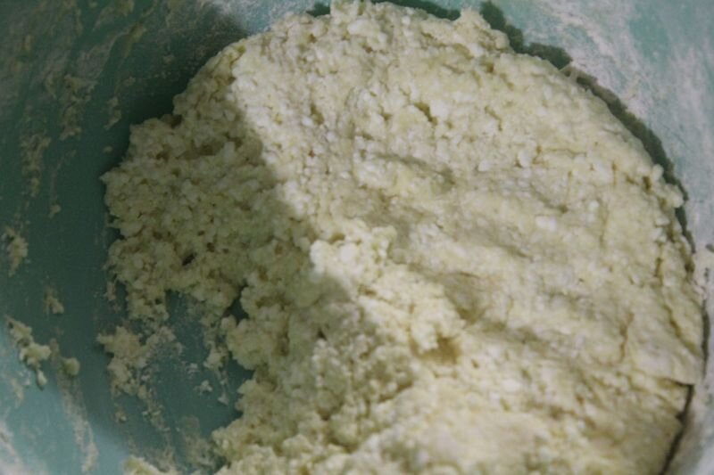 Размешиваем в подходящей емкости яйца с солью, добавляем творог, муку, перемешиваем, чтобы творожные крупинки не разбить, чтобы они были видны в тесте.