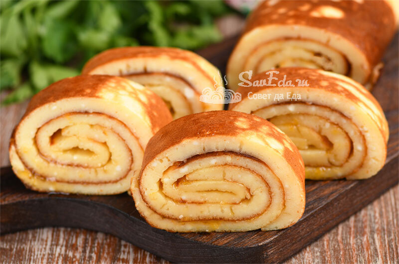 Не надо ничего долго замешивать и выпекать в духовке. На приготовление теста уходит несколько минут. Рулет готовится на сковороде очень просто и всего за 20 минут. В качестве начинки использую варенье, джем, взбитые сливки, вареную сгущенку или быстрые кремы на основе творога или сметаны. Такой рулет можно подавать на завтрак или в качестве десерта.
