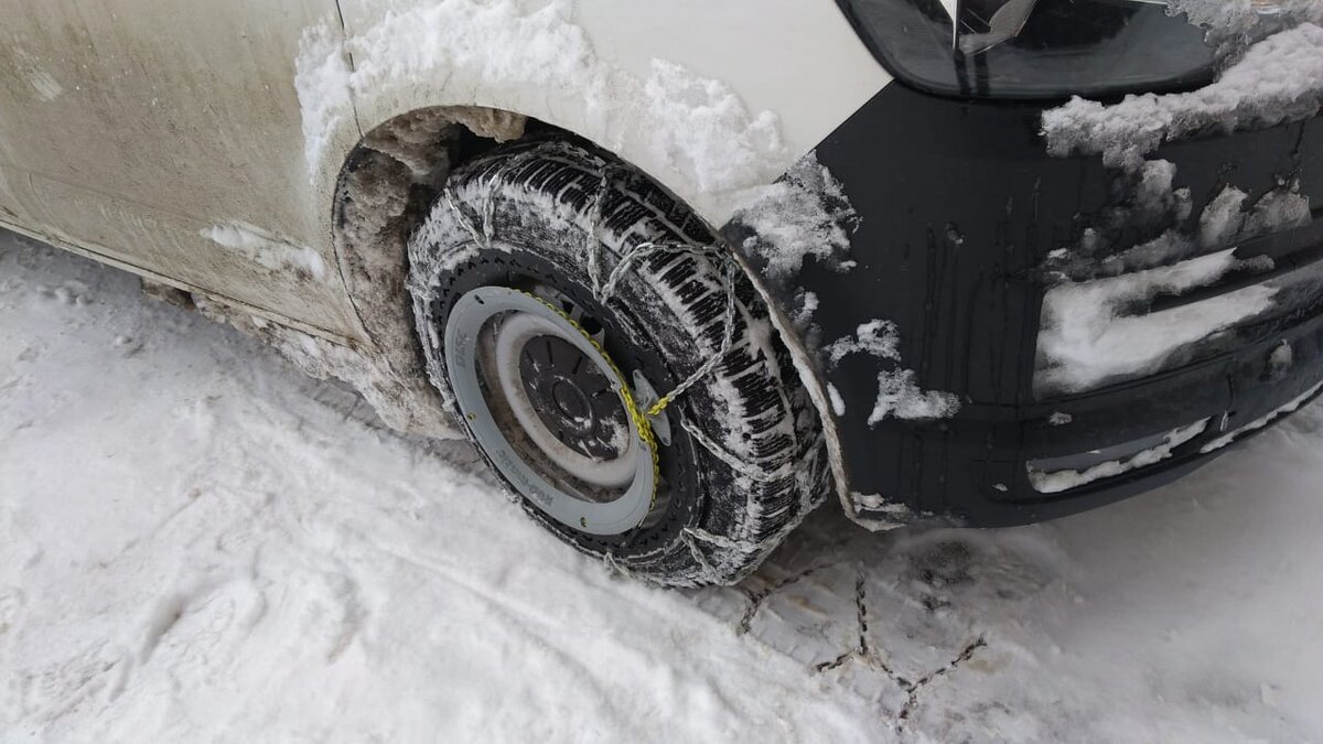 Немного повозившись с одеванием цепи начались испытания эффективности их. Сел за руль, перевел положение переключателя в положение Драйв, отпустил тормоз... Я мягко говоря был очень удивлен... Причем очень приятно. Бусик спокойно, как ни в чем не бывало, выбрался из сугроба.