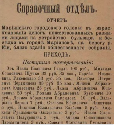 Отчёт Мариинского городского головы в расходовании денег, пожертвованных разными лицами на устройство бульвара и беседки в городе Мариинске, на берегу р.Кии, близ здания общественного собрания. ПРИХОД Поступило пожертвований: