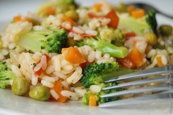 4. Следом отправила мелкие кубики моркови. Затем высыпала рис и, как я уже говорила, поджарила его.