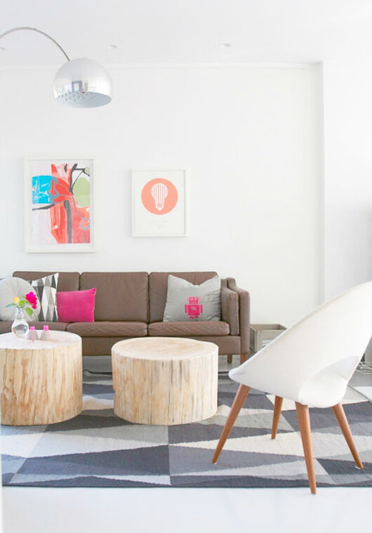 Фото этих гостиных публиковали разные норвежские блогеры. И если пеньками-табуретками уже никого не удивишь, то, например, кофейные столики из строительных паллетов – это что-то новое. А точечное использование черно-белых орнаментов – это просто сказка.