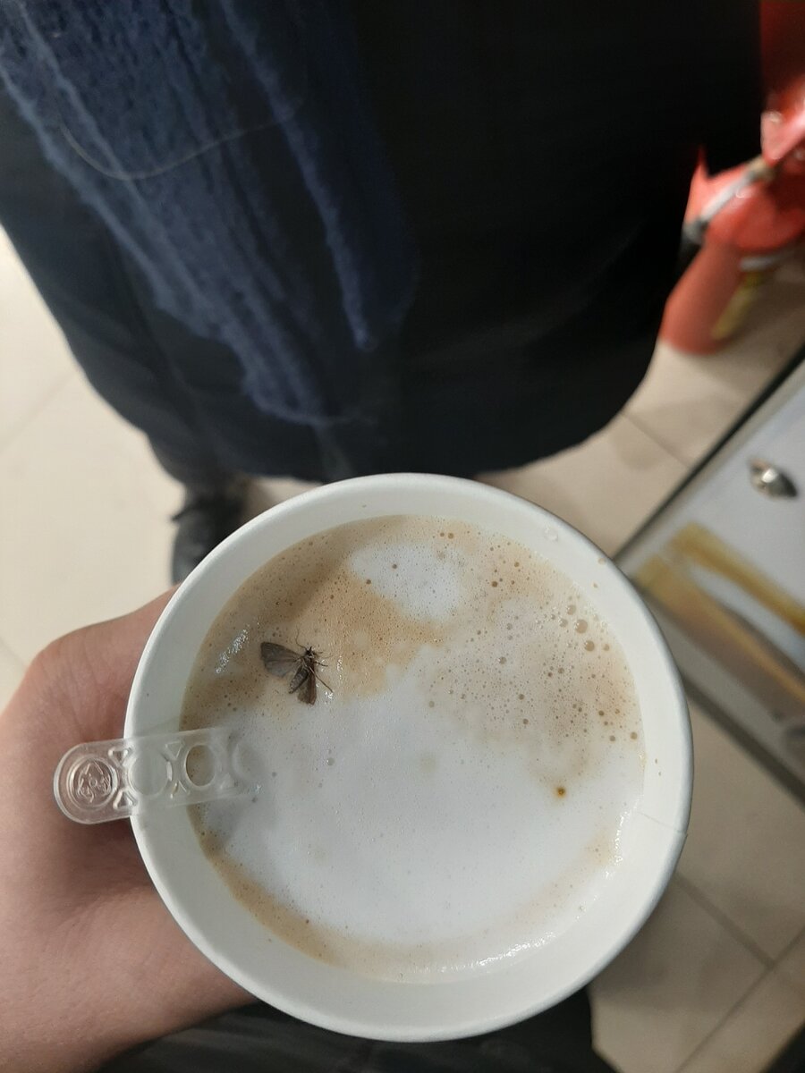 Вышли погулять с девушкой вечером.Приши в маркет купить кофейка чтоб согрется холодной зимой.Вставляем деньги в аппарат,выбираем капучино и при выдачи на был выдан белковый бонус в виде моли.